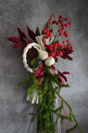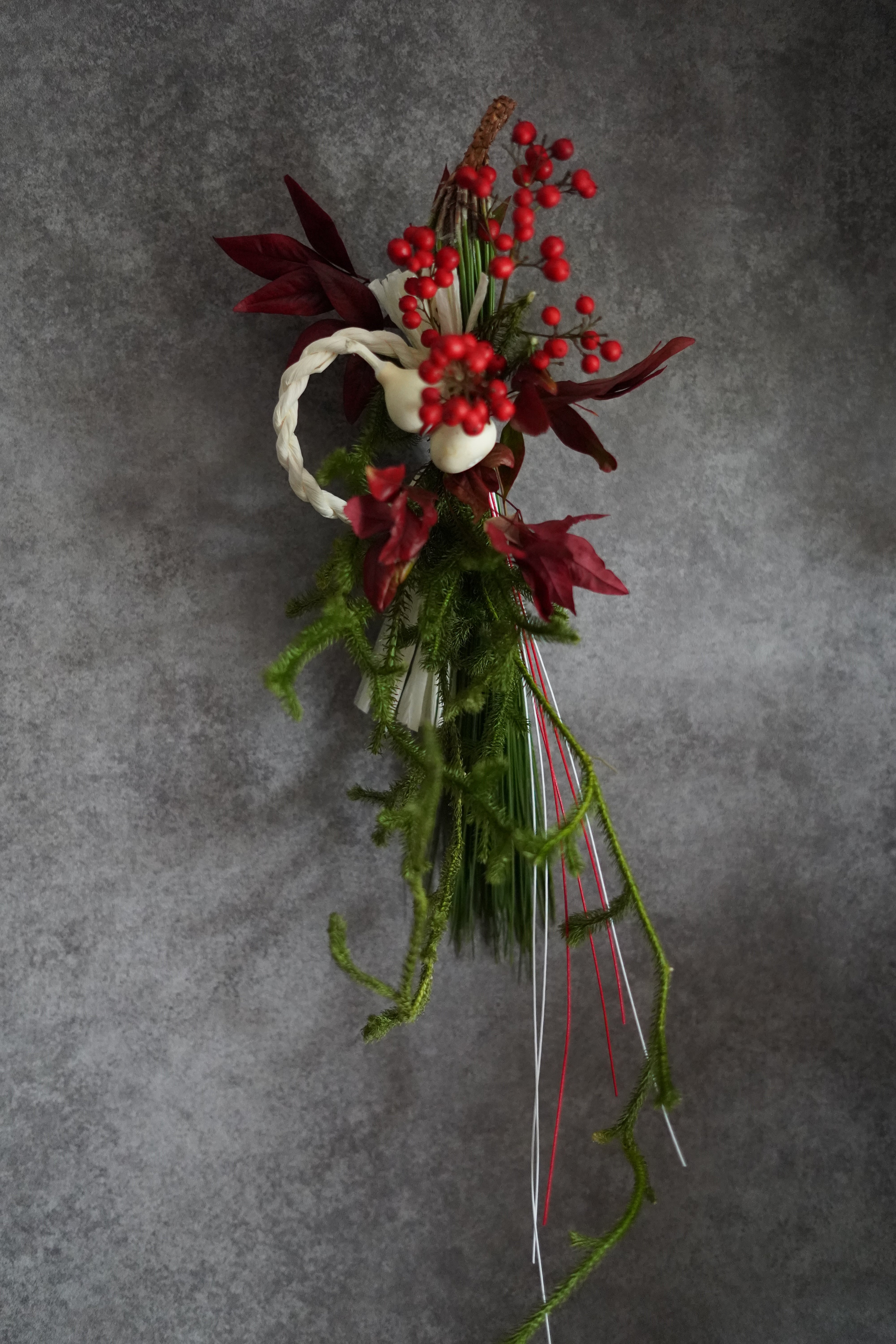 南天の実、ヒカゲカズラ、水引を使ってシンプルな中に柔らかさのあるお飾りです。